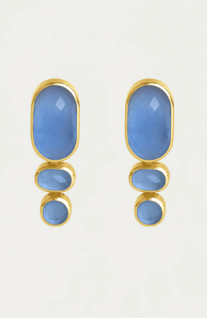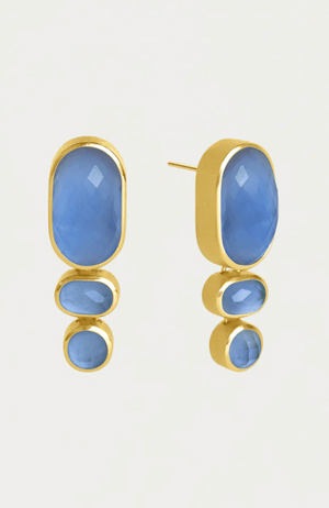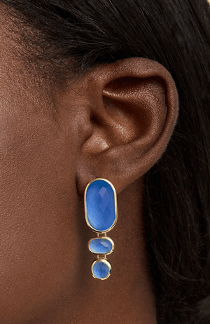 These three-tier Mercer earrings in Celestial Blue blend graceful design with rich color for evening elegance. Featuring handcrafted man-made gemstones with a pearlescent backing, they shimmer with depth and light. Brushed 22 karat gold frames the vibrant blue stones with refined polish, creating a striking statement piece that enhances any sophisticated look.