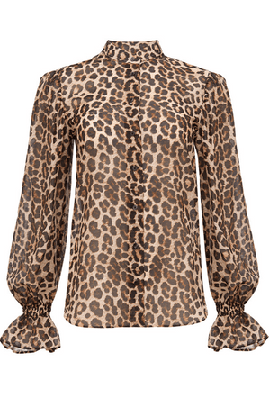 The NEW MAGIE BLOUSE in MULTI BROWN combines a sleek band collar with refined flare cuffs for an elegant silhouette. Crafted from lightweight fabric with an elevated leopard print, it offers both comfort and a striking statement. Perfect for enhancing your sophisticated wardrobe with subtle animal-inspired flair.
