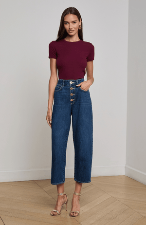 Crafted from ultra-soft jersey, the Ressi Fitted Tee in Dark Port offers a refined silhouette with its slim cut and short sleeves. Designed to flatter the figure, this tee features a classic crew neck for a timeless, sophisticated look that pairs effortlessly with any wardrobe.