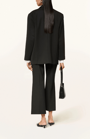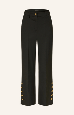 The FRANCE STATEMENT SLIT PANT in BLACK features a flattering cropped flare silhouette crafted from an elegant black wool substitute for lasting comfort. Gold buttons along the side seam add a subtle ’80s-inspired detail, while side pockets offer practicality with a contemporary edge. These trousers seamlessly blend timeless sophistication with bold style, making them a distinguished addition to any wardrobe.