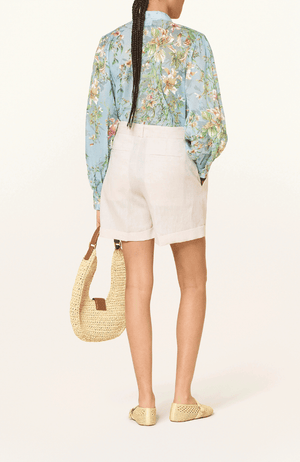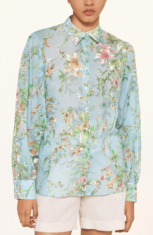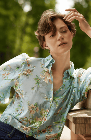 Elevate your wardrobe with the ALICIA BLOUSE, a refined cotton piece that embodies understated elegance. Crafted in a sophisticated blue-green palette, this blouse features gracefully voluminous balloon sleeves that capture movement and sophistication. The exquisite botanical print adds a layer of artistic refinement, making it an essential investment for the discerning woman who values both quality and timeless style.