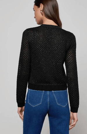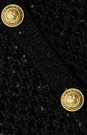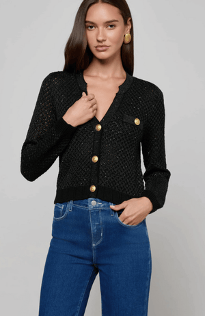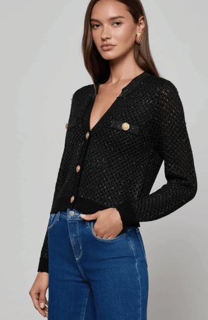 Elevate your wardrobe with the BLANCA SEQUIN CARDIGAN in Black Gunmetal Gold, featuring a delicate sequined pointelle knit that adds subtle shimmer to any outfit. This lightweight layer offers a refined blend of elegance and comfort, perfect for both polished and relaxed occasions. The embossed dome button closure enhances the cardigan’s sophisticated appeal, making it an effortless choice for chic, everyday style.