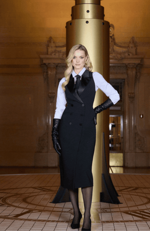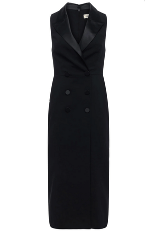 The Catherine Midi Dress in Black elegantly transforms traditional suiting with a sleek, sleeveless design and sharp satin lapel. Its double-breasted front and tailored cut create a striking, body-skimming silhouette that ends at mid-calf. Perfect for refined occasions, this dress delivers a poised and polished look that combines timeless sophistication with modern edge. Featured in the L'Agence Fall '25 NYFW presentation.