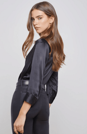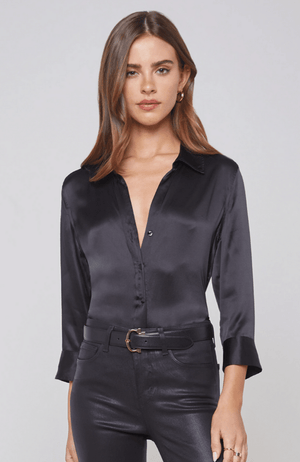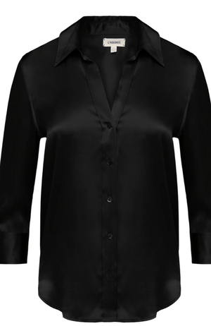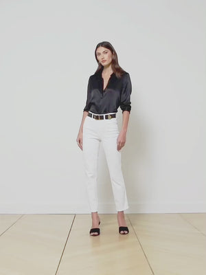 A classic button-down blouse with a luxurious, light catching luster. Charmeuse silk in soft ivory drapes effortlessly to a shorter, curved hem. Three-quarter-length sleeves and a relaxed open collar balance elegance with wearability. 100% silk.
