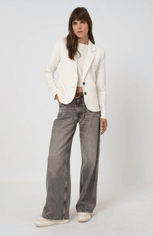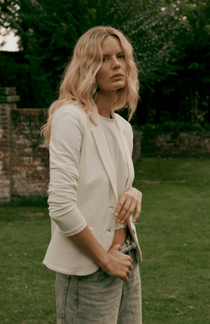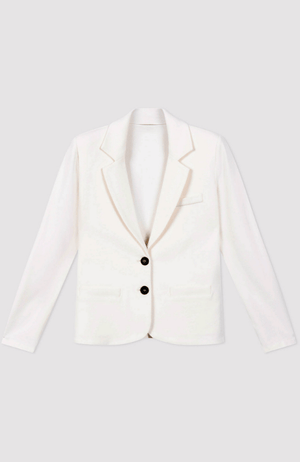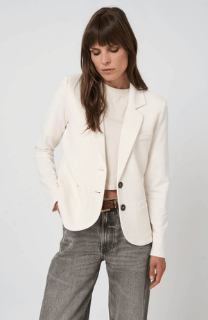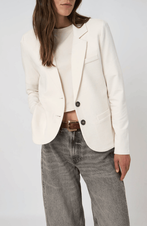 Sculpted from a luxurious modal-cotton French terry, this ivory blazer embodies refined elegance with its sumptuous soft hand and distinctive loopback texture. Expertly tailored with a gently contoured silhouette, it features precision lapels, a sophisticated two-button closure, and gracefully proportioned front pockets. The elongated sleeves and softly rounded hem create an effortlessly polished line—equally at home in the boardroom or layered over premium cashmere for weekend sophistication. A versatile investment piece that transcends occasion