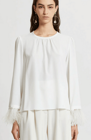 Feel luxurious and sophisticated in the Marella Rivista Cream Blouse With Feather Detail. Crafted with a luxurious silk blend crepe de chine, this blouse features a gathered round neckline and statement feather cuff detail. A keyhole back completes this timeless look.