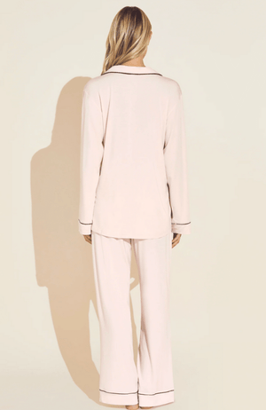 Experience timeless comfort with the GISELE LONG PJ SET in Sorbet Pink/Black, crafted from luxurious TENCEL™ Modal fibers blended with a touch of elastane. This ultra-soft, OEKO-TEX® Standard 100 certified fabric ensures gentle, non-toxic wear. Featuring elegant contrast piping, a button-front top with a classic notch collar and functional pocket, and low-rise straight-leg pants with a discreet elastic waistband, this set redefines relaxed sophistication. Perfectly paired with everyday lingerie, it invites you to unwind in effortless style and serenity.