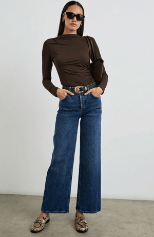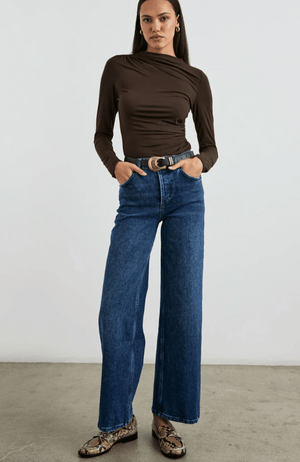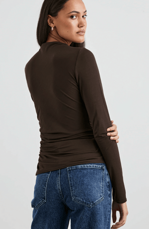 The Joelle Top in Espresso redefines the classic long sleeve with a contemporary edge. Crafted from soft gauge jersey, it offers a comfortable, refined fit. Its standout feature is the asymmetrical mock neck, enhanced by delicate shirring along the right shoulder, adding subtle elegance and texture. Perfect for those seeking a sophisticated yet effortless look.