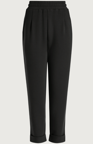 These slim, tapered pants in classic black are designed with a refined rolled cuff and precisely shaped pockets for a polished look. Front and back darts at the waistband ensure a flattering fit, elevating your everyday style. Perfectly versatile, they complement pieces like the DAVIDSON SWEAT DoubleSoft® or CALLIE KNIT, making them a sophisticated wardrobe essential.