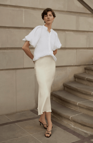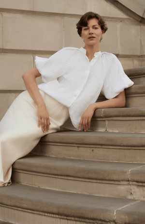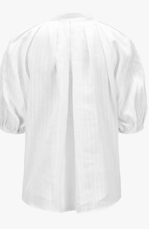 Introducing the Sophie Blouse in pristine white—a refined piece that embodies understated elegance. Crafted from premium cotton with a delicate pinstripe pattern, this blouse features gracefully voluminous balloon sleeves that strike the perfect balance between contemporary design and timeless femininity. The short sleeve silhouette offers effortless sophistication, ideal for elevating both casual and polished occasions. A wardrobe essential for those who appreciate quality craftsmanship and subtle luxury.